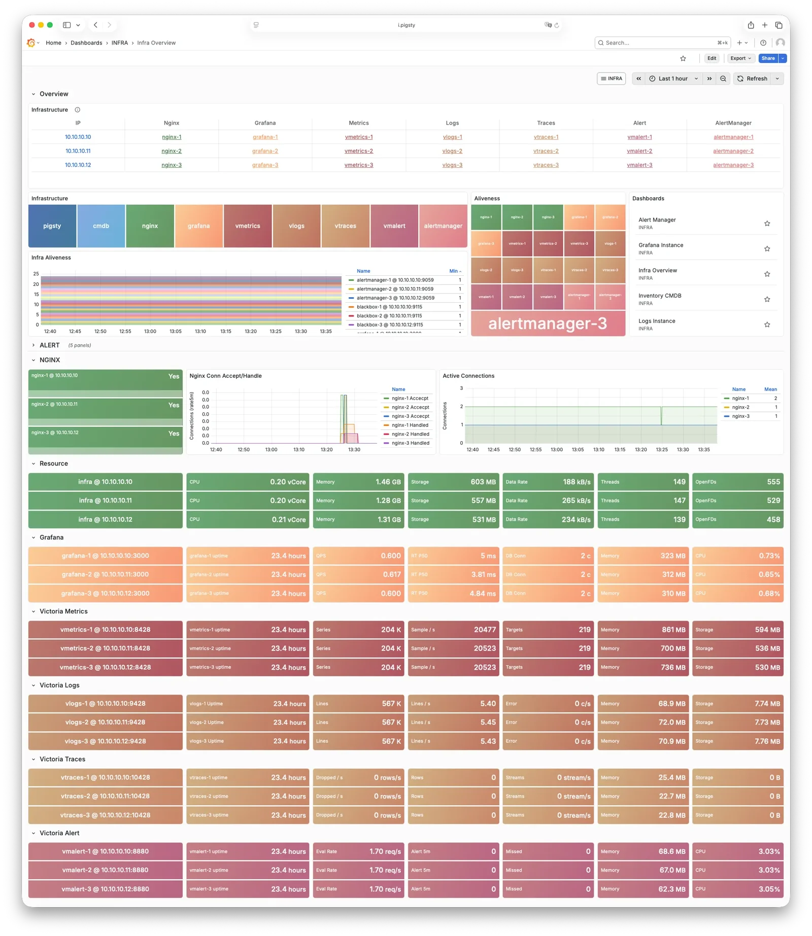 这将为你提供一个功能完备的可观测性技术栈全家桶 (Prometheus、Grafana、Loki、AlertManager、PushGateway、BlackboxExporter 等) ,以及一个内置的 PostgreSQL 单机实例作为 CMDB,也可以开箱即用。 (集群名 pg-meta,库名为 meta)。