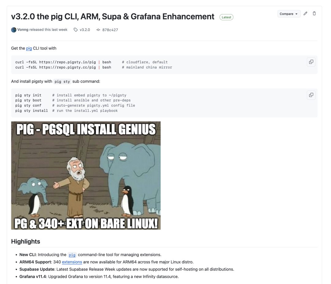 Pigsty 迎来了 2024 年的最后一次发布 v3.2。本次发布带来了命令行工具 pig,以及完善的 ARM 扩展支持,两者合体,为用户带来 10 大主流 Linux 系统上丝滑的 PostgreSQL 交付能力。