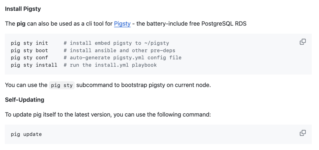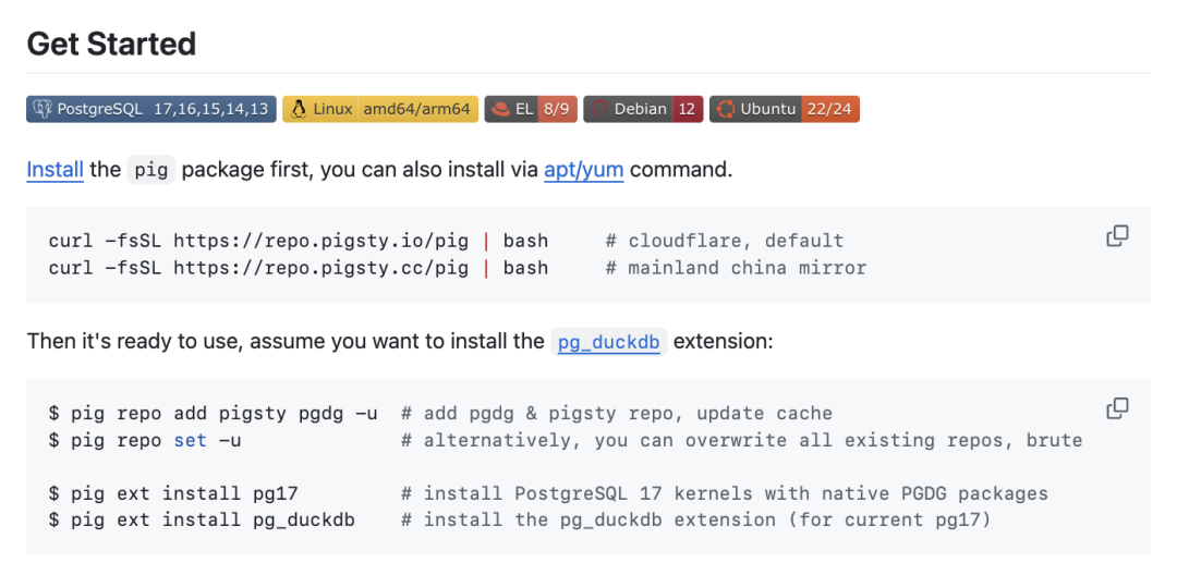 Pig 本身是用 Go 编写的轻量级二进制,无依赖、易安装:只需一行命令即可完成安装。它尊重操作系统的包管理传统,不重新发明轮子,基于 yum/dnf/apt 实现包管理。