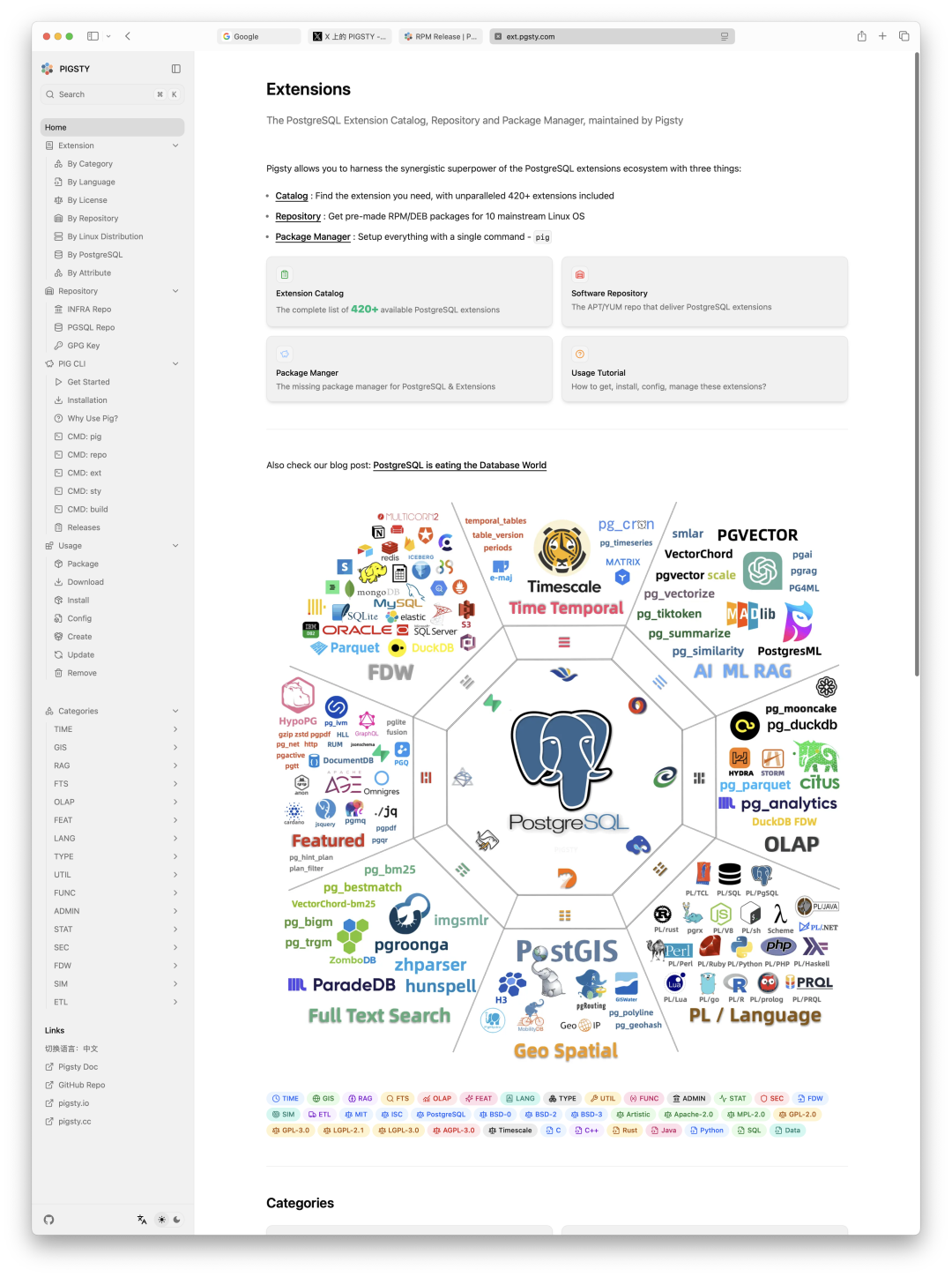 扩展目录站点也已全面翻新,采用 Next.js 重构,观感大幅提升,新地址:https://ext.pgsty.com