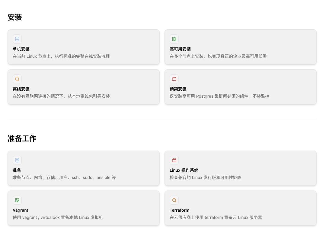 - 减少出错点:许多用户反馈的安装报错都发生在本地 Repo 下载和 Nginx 服务拉起阶段(如 el9.aarch64 上 PGDG 配置错误导致的 patroni-etcd 安装失败)