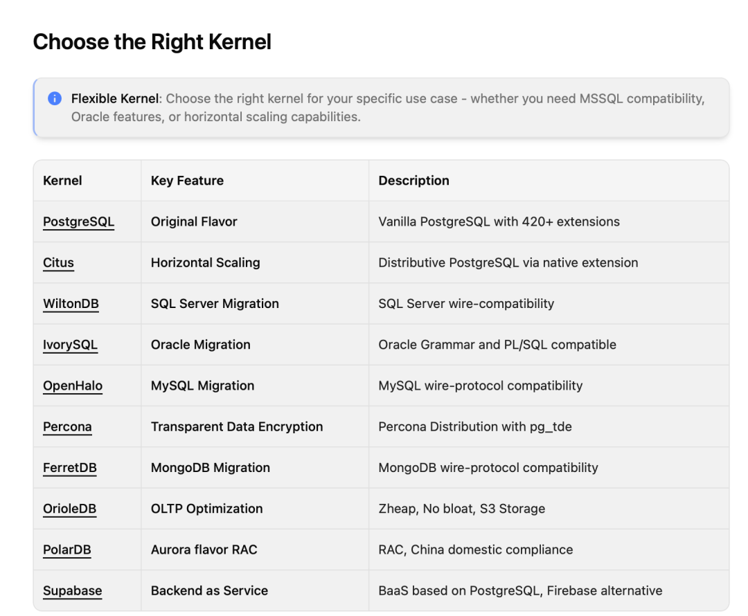 至此,Pigsty 支持的 PostgreSQL 内核数量已达到 10 个。
