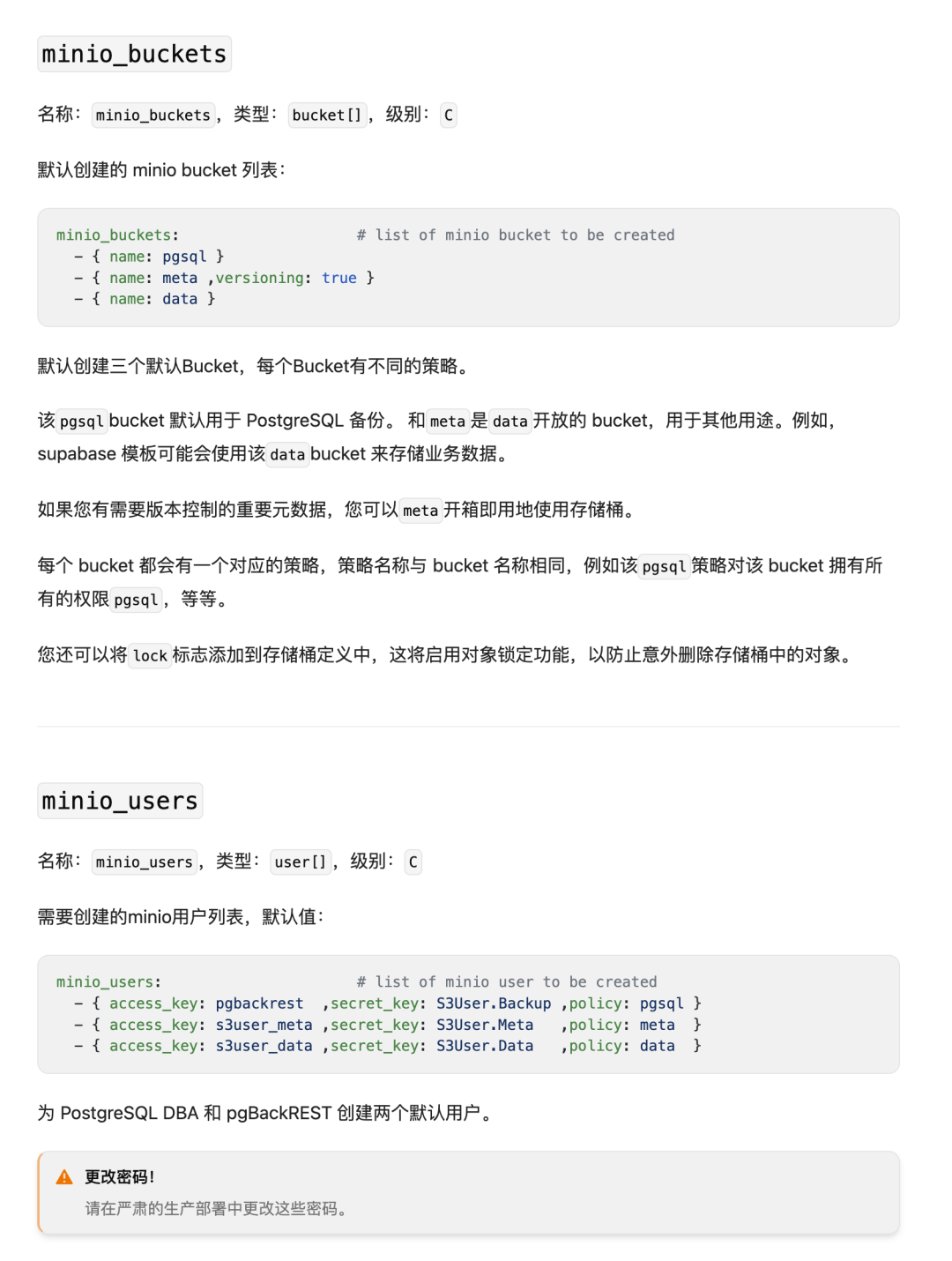 pg_fs_backup:重命名为pg_fs_backup,默认值为/data/backups。pg_rm_bkup:重命名为pg_rm_backup,默认值为true。pg_fs_main:现在默认值调整为/data/postgres。nginx_cert_validity:新增参数,用于控制 Nginx 自签名证书的有效期,默认为397d。minio_buckets:默认值调整为创建名为pgsql、meta、data的三个桶。minio_users:移除dba用户,新增s3user_meta和s3user_data用户,分别对应meta和data桶。minio_https:新增参数,允许配置 MinIO 使用 HTTP 模式。minio_provision:新增参数,允许跳过 MinIO 置备阶段(跳过桶和用户的创建)。minio_safeguard:新增参数,启用后会在执行minio-rm.yml时中止操作。minio_rm_data:新增参数,控制在执行minio-rm.yml时是否删除 minio 数据目录。minio_rm_pkg:新增参数,控制在执行minio-rm.yml时是否卸载 minio 软件包。etcd_learner:新增参数,允许 etcd 以学习者身份初始化。etcd_rm_data:新增参数,控制在执行etcd-rm.yml时是否删除 etcd 数据目录。etcd_rm_pkg:新增参数,控制在执行etcd-rm.yml时是否卸载 etcd 软件包。