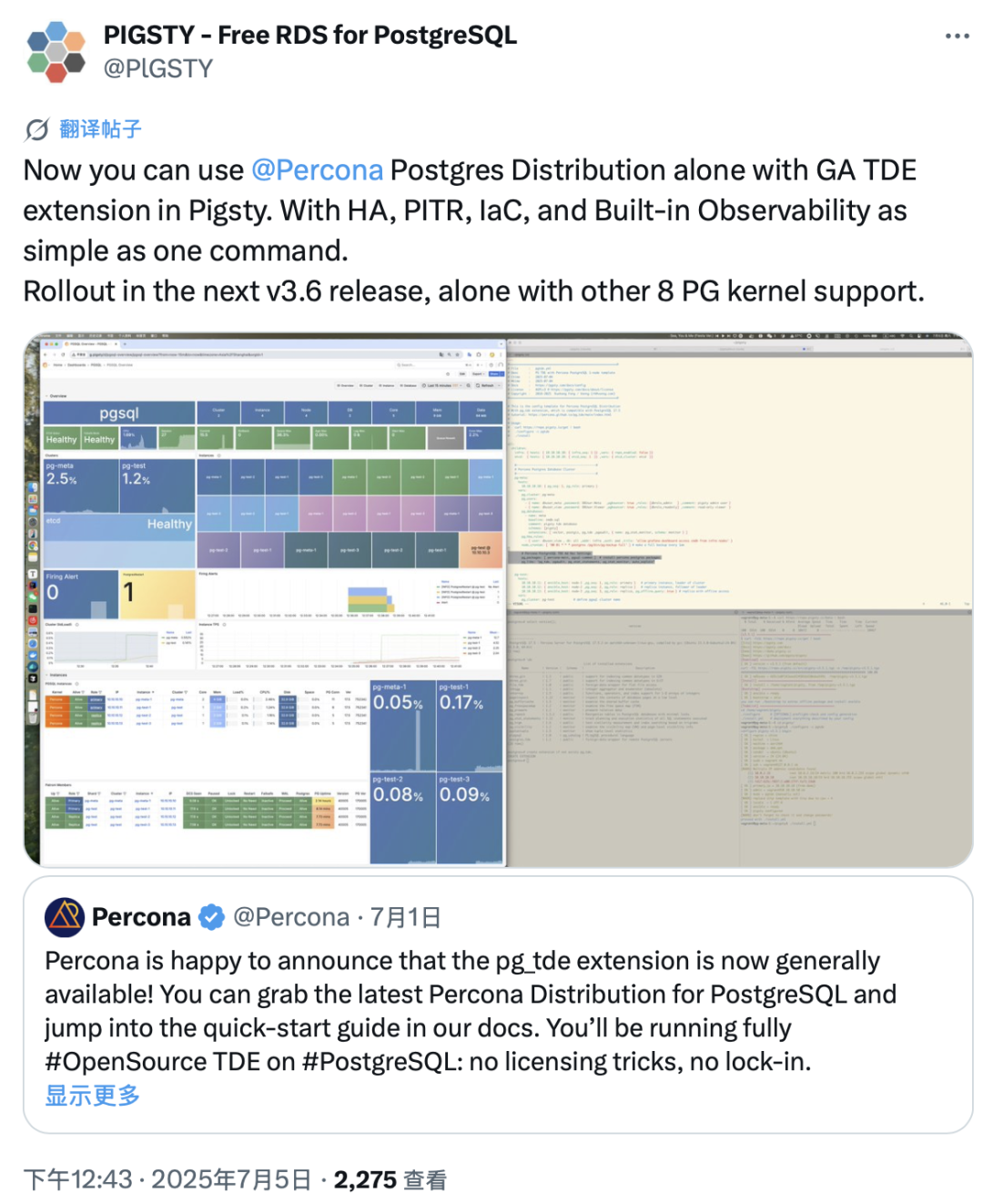 目前该扩展需要运行在打过补丁的 PostgreSQL 内核上 —— 即 Percona 的 Postgres 发行版。Pigsty 在官宣后即刻完成了支持,只需两行命令即可启用并安装,同时享受 Pigsty 提供的完整 RDS 能力:监控、高可用、PITR、IaC 等,与原生 PG 内核别无二致。
